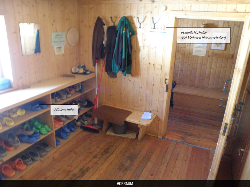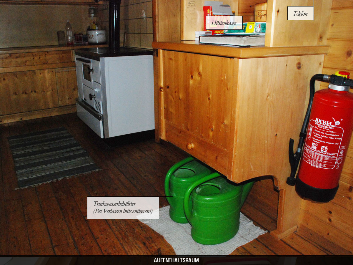 Es wird gebeten die Hütte nur mit den Hausschuhen zu betreten. Diese befinden sich im Vorraum. Das Wasser ist vom Brunntrog zu holen. Die Kanister dafür sind unter dem Telefonkasten im Aufenthaltsraum bereitgestellt. Dort befinden sich auch ebenfalls das Anzünder, Schreibmaterial und das Hüttenbuch. Nach Bezug soll sich bitte jeder Besucher mit vollständiger Adresse in das Hüttenbuch eintragen.